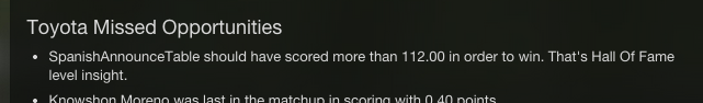 That’s Hall of Fame Insight right there!! The fuck?!? Hey, did you know if you score the same or more than the team you play, you don’t lose? No shit!! What is this the Mike Francesa show? And the first line of that Toyota Missed Opportunities thing is always so fucking stupid, even when it makes sense.
