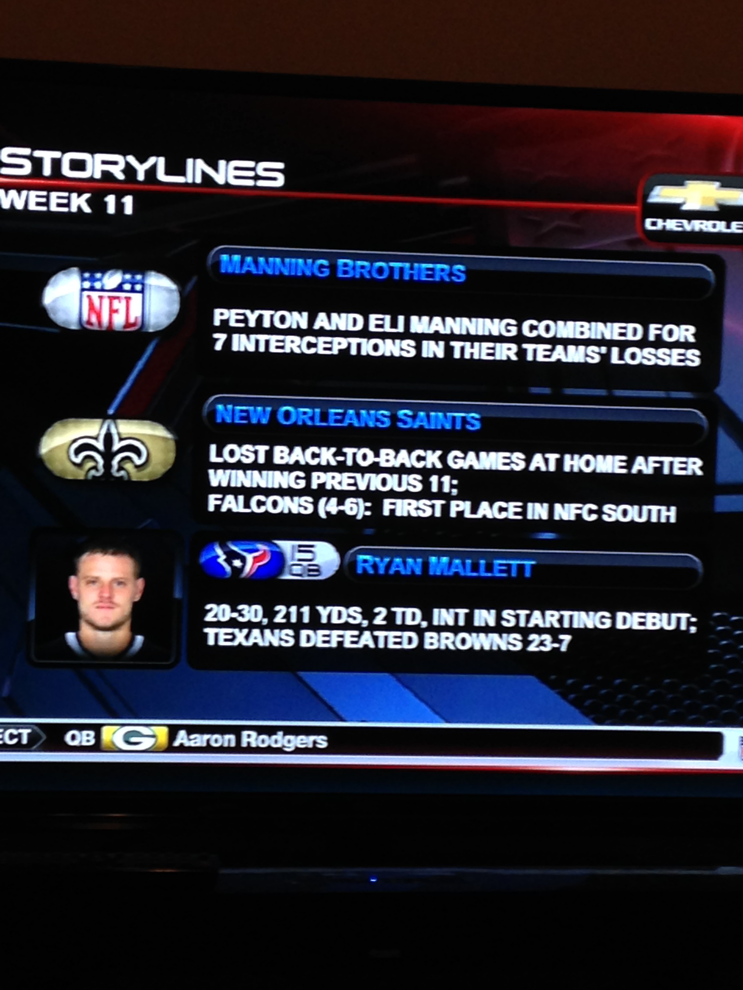 The Mannings. Oooohhhhh The Mannings. 7 combined interceptions. Peyton (thankfully) had one of his typical days where he played like shit but had really good numbers. Eli? Well, Eli didn’t have that bad of a day, as long as you don’t count the less 50% completion percentage, 2 sacks, and FIVE INTERCEPTIONS.