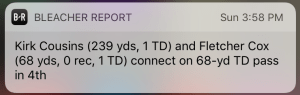 Kirk Cousins. No, I do not like that. I had the Eagles-R-words game on my non-RedZone TV on Sunday and man was I treated to a masterpiece in quarterbacking. It was like watching a man physically turn into the poop emoji right before my very eyes. When he wasn’t getting pummeled or running in for his life, Kurt was sailing passes over wide open receivers’ heads, bouncing the ball to his tight ends, or trying to jam it into double coverage.