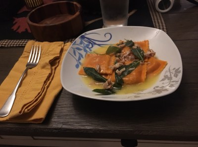 These weren’t very good. Which is saying something because BoomBoom made a delicious butter, sage sauce to eat on them. The filling seemed like it was just pumpkin. So it tasted very plain.