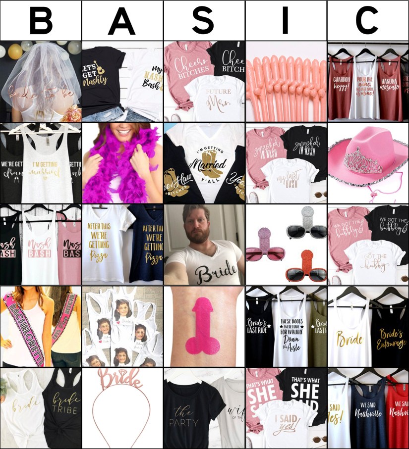 Then I thought about making a BINGO card, for all the random things we’ll see on this trip. So I tried to think of what Nashville has more of than any other city. And I figured out the answer: Bachelorette Parties.